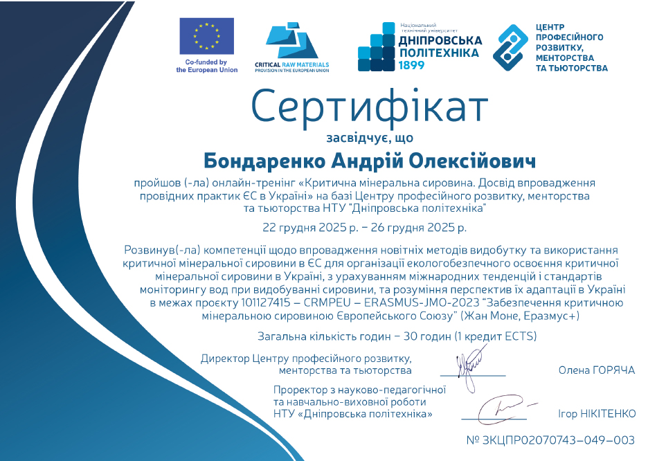 10. Центр професійного розвитку персоналу НТУ «Дніпровська політехніка». Тренінгова програма «Критична мінеральна сировина. Досвід впровадження провідних практик ЄС в Україні». Сертифікат № ЗКЦПР02070743-049-003. Кількість годин – 30 (1 кредит ЄКТС). 22.12.2025 – 26.12.2025р.
